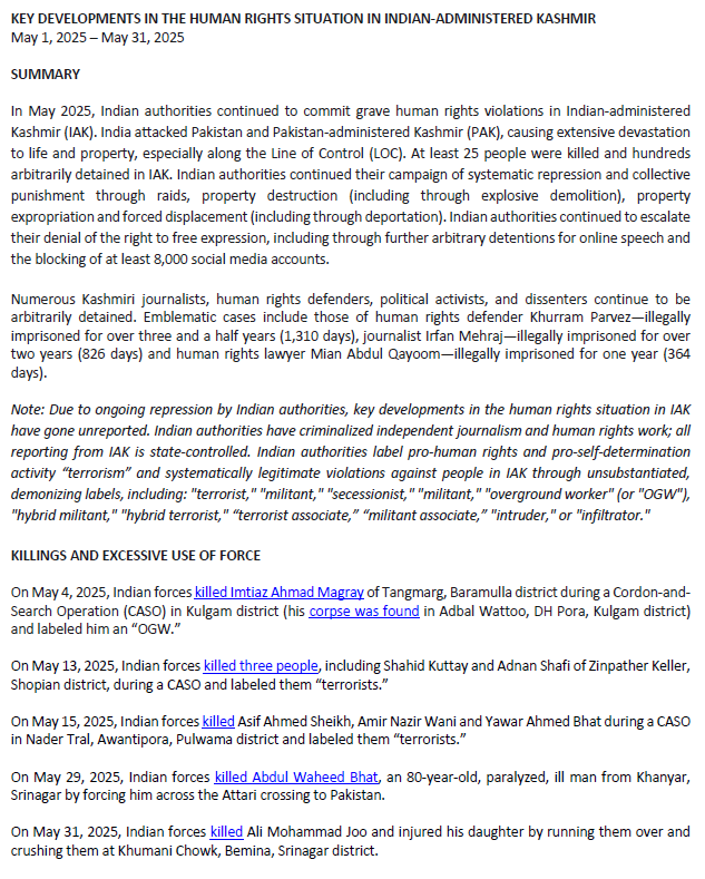 In May 2025, Indian authorities continued to commit grave human rights violations in Indian-administered Kashmir (IAK). India attacked Pakistan and Pakistan-administered Kashmir (PAK), causing extensive devastation to life and property, especially along the Line of Control (LOC). At least 25 people were killed and hundreds arbitrarily detained in IAK. Indian authorities continued their campaign of systematic repression and collective punishment through raids, property destruction (including through explosive demolition), property expropriation and forced displacement (including through deportation). Indian authorities continued to escalate their denial of the right to free expression, including through further arbitrary detentions for online speech and the blocking of at least 8,000 social media accounts.